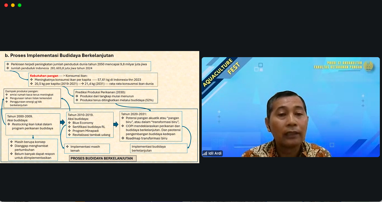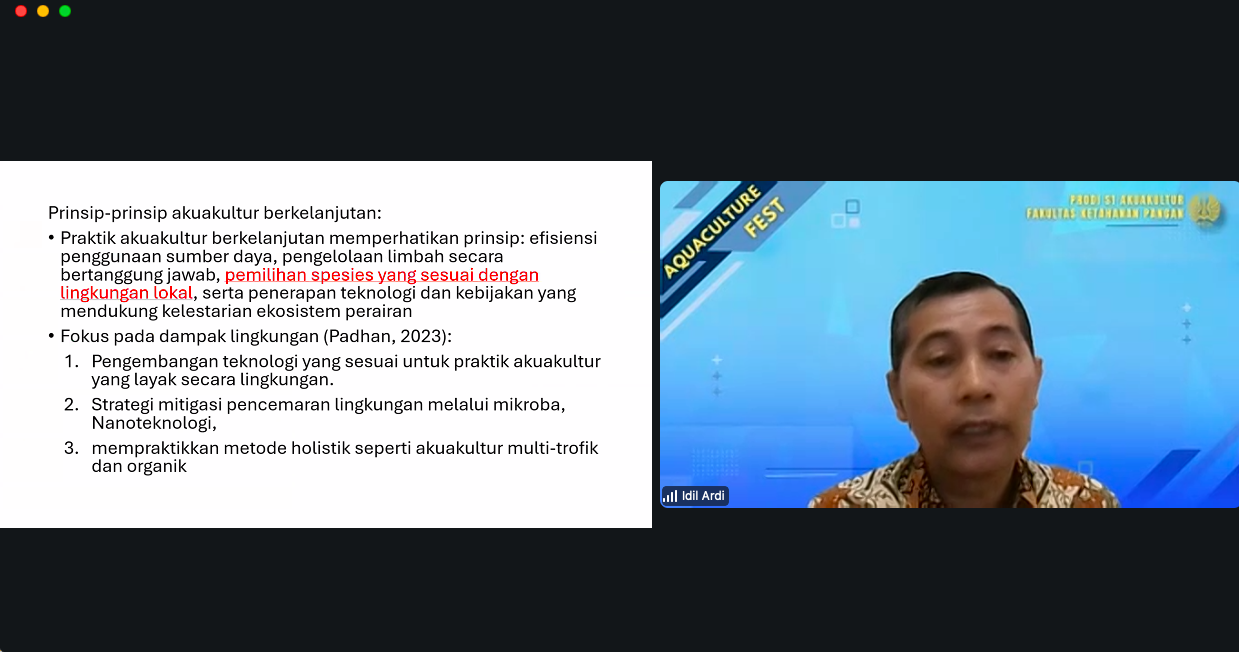 Dalam paparannya, Dr. Idil Ardi, S,Pi., M.Si., menjelaskan bahwa akuakultur yang berkelanjutan berfokus pada keberlanjutan lingkungan, ekonomi, dan sosial untuk meningkatkan pembangunan kapasitas dan memanfaatkan lahan secara efektif bagi sektor Akuakultur. Praktik akuakultur berkelanjutan memperhatikan prinsip: efisiensi penggunaan sumber daya, pengelolaan limbah secara bertanggung jawab, pemilihan spesies yang sesuai dengan lingkungan lokal, serta penerapan teknologi dan kebijakan yang mendukung kelestarian ekosistem perairan.