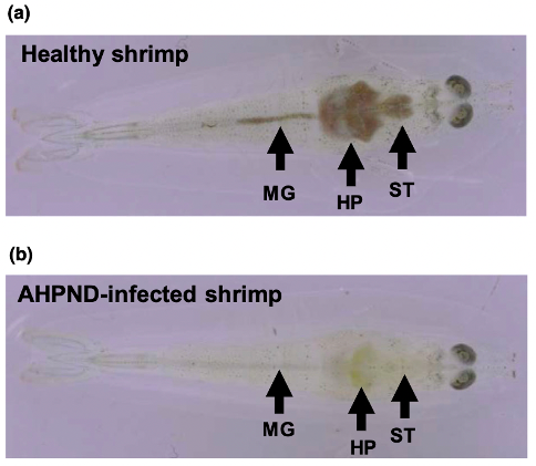 Bagian tengah usus (MG), hepatopankreas (HP), dan lambung (ST) yang normal berwarna coklat seperti terlihat pada gambar (a) udang yang sehat semuanya berubah pucat pada (b) udang yang terinfeksi AHPND (Sumber: Kumar et al., 2020).